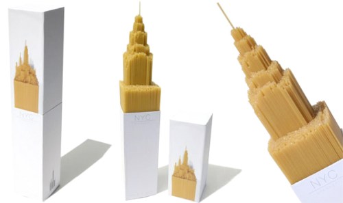 “Creé este packaging para espaguetis para un proyecto de la universidad el año pasado. El proyecto debía embalar uno de estos 5 artículos :huevos, una rosa, sopa de sobre, espaguetiso mármol. Escogí espagueti. Los espagueti se asientan sobre una estructura en 3d del edificio Chrysler , de Nueva York.”