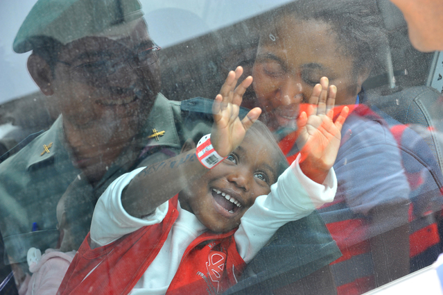 En la instantánea premiada, un niño recién llegado en una patera a Tarifa sonríe ante las bromas de un agente de la Guardia Civil.
