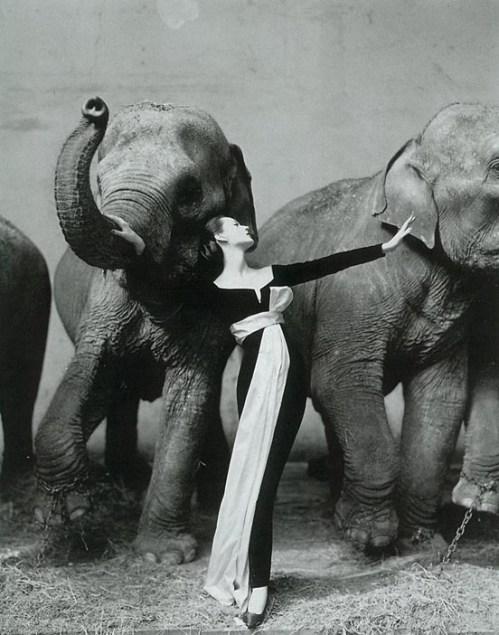 La fotografía fue tomada en el Circo de Invierno de la capital francesa en 1955. La bellísima mujer que aparece rodeada de los dos elefantes es Dorothy Virginia Margaret Juba (1927–1990), también conocida como Dovima, una modelo estadounidense de los años ’50. El traje negro que usó en aquella fotografía fue el primer vestido de noche que Yves Saint Laurent diseñó para la marca Christian Dior. Algunas copias de la célebre fotografía están ahora en el Museo Metropolitano de Arte y el Museo de Arte Moderno, ambos en Nueva York.