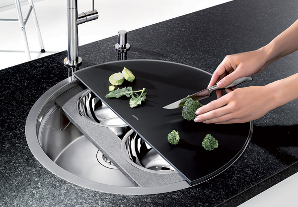 A partir de varios gadgets que se acoplan al lavabo, podemos ir cambiando sus usos. Una tabla para cortar, unos recipientes para echar los desechos, unos escurridores…
