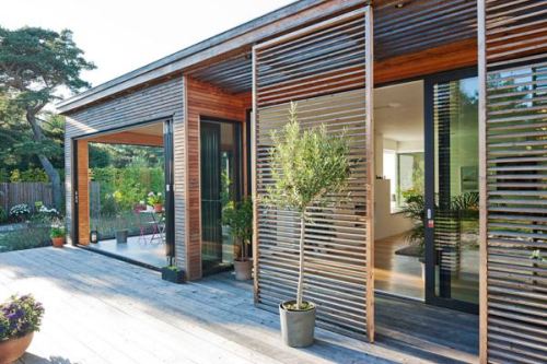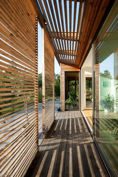 Los muros exteriores están revestidos con ladrillos de arcilla. Frente a los ventanales con salida al porche, se diseñaron unas puertas correderas de madera de roble, que permiten la entrada de luz, pero además aportan privacidad al interior.