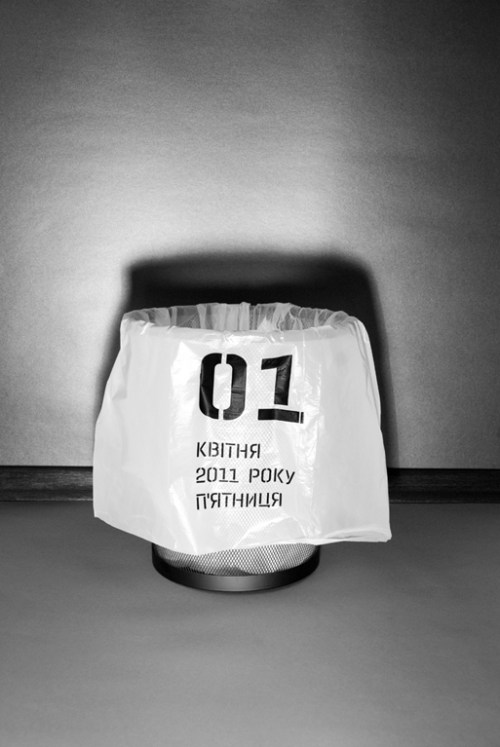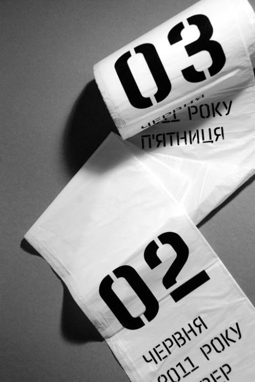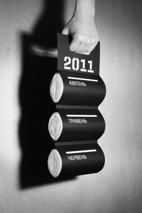 Se trata de un calendario organizado en rollos de basura mensuales, cada rollo contiene una bolsa para cada día del mes. Gráficamente, me resulta súper interesante.