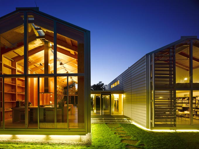 La vivienda, de madera, cristal y carpinterías metálicas, está dividida en dos módulos, unidos entre sí. En una de las casas-módulo, encontramos la cocina y el comedor en la planta baja y «la galería» en la planta superior. En la segunda casa-módulo, se sitúan las dos oficinas y un cuarto de huéspedes en la planta baja y los dormitorios y cuartos de baño que están arriba.