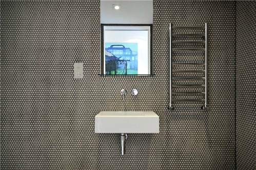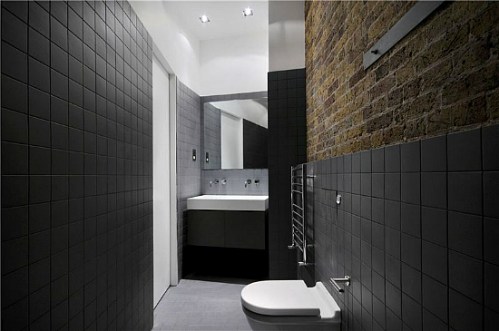 Cada dormitorio tiene entrada directa al cuarto de baño, donde se combina el azulejo negro con la pared de obra vista. Son oscuros, pero muy funcionales y bien equipados. El aire «industrial» en estas zonas se hace todavía más evidente.