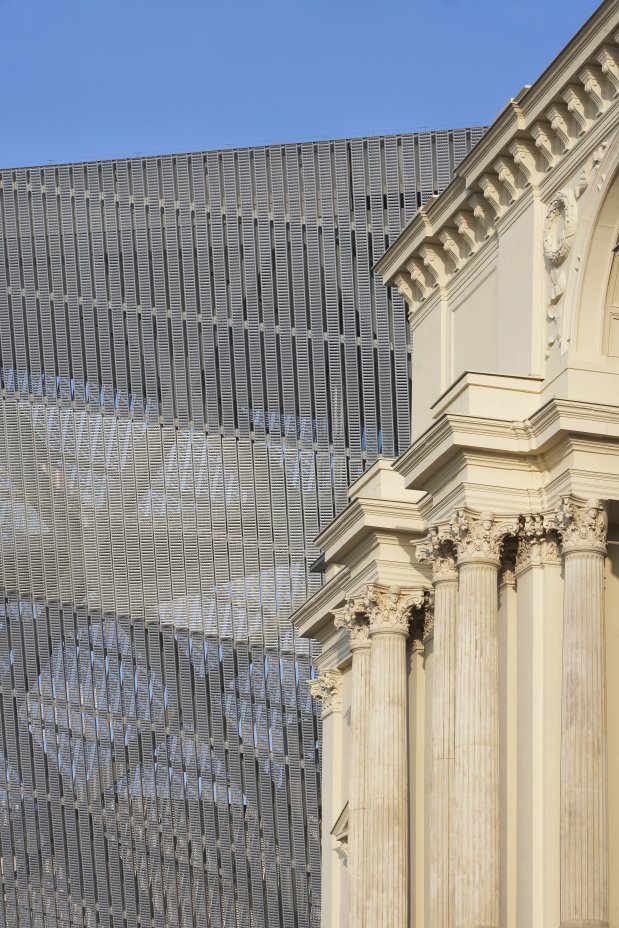 Las líneas rectas y simétricas de la fachada original del museo contrastan con la inmensa cuña de acero (de 200 toneladas y 30 metros de altura) que pretende “establecer una clara interrupción de estilo para penetrar en el arsenal histórico y crear una nueva experiencia para el público”.