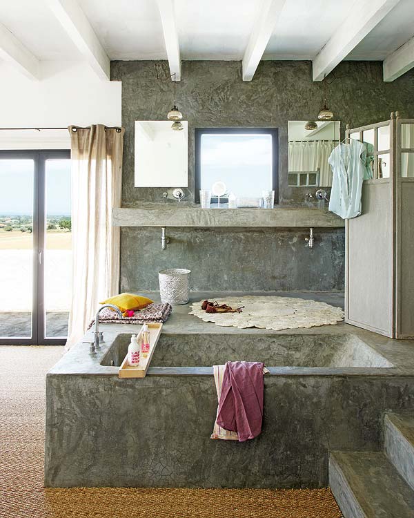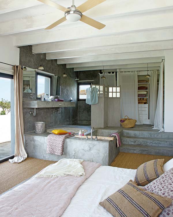 El cemento pulido se suma a ellos para adquirir diversas formas y transformarse en un mobiliario a medida, con gran valor decorativo. En el salón se convierte en un gran sofá en forma de U, mientras que en el dormitorio principal integra el cabecero y la base para el colchón. Pero además, se utiliza para crear un segundo nivel en esta habitación tipo suite, donde se ubican el baño y el vestidor, que comparten espacio con la zona de descanso, aunque cada uno tiene su territorio bien definido.