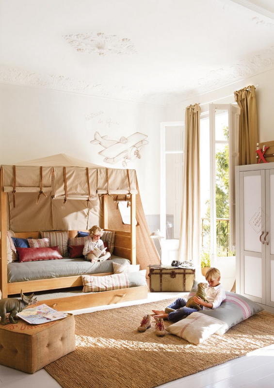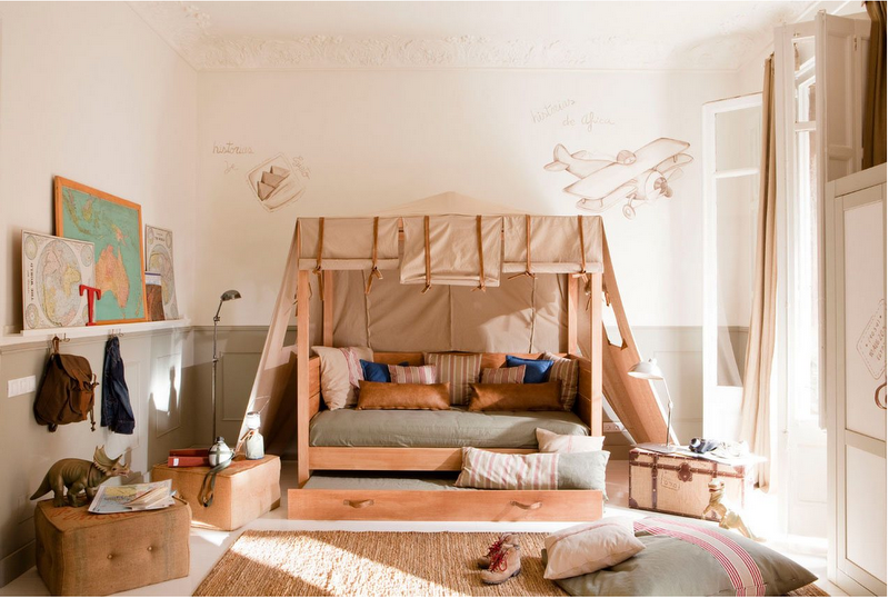Esta habitación tiene que ser el sueño de cualquier niño explorador, aventurero y curioso. Está llena de pequeños detalles que hacen alusión a los viajes, como los baúles maleta, los mapas, los sellos en los armarios y esa cama «tienda de campaña» que es simplemente genial.