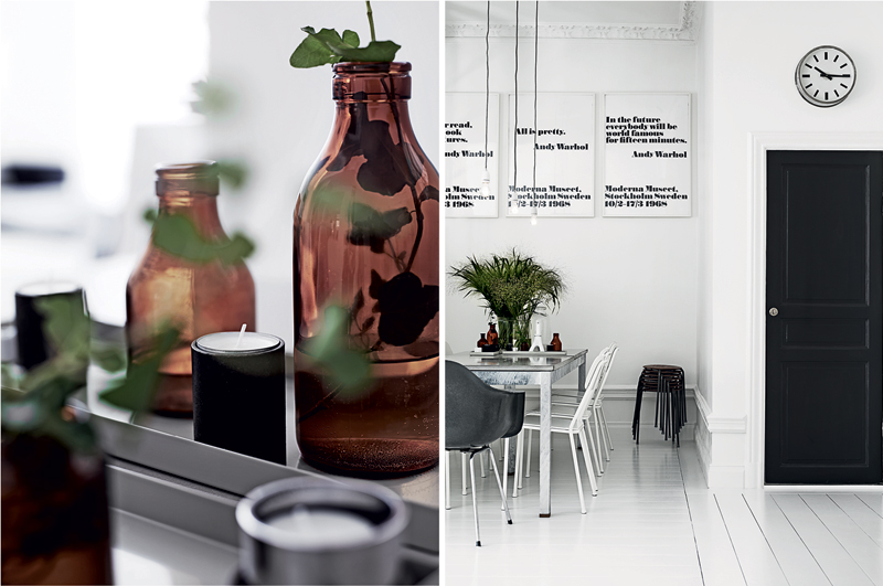 Suelos, zócalos, paredes y techos en blanco, como no podía ser de otra manera, los cuadros enmarcados en negro, mobiliario de líneas clásicas nórdicas en madera y textiles en tonos grises. La misma fórmula de siempre, pero alegrada y mejorada con los detalles personales de sus inquilinos.