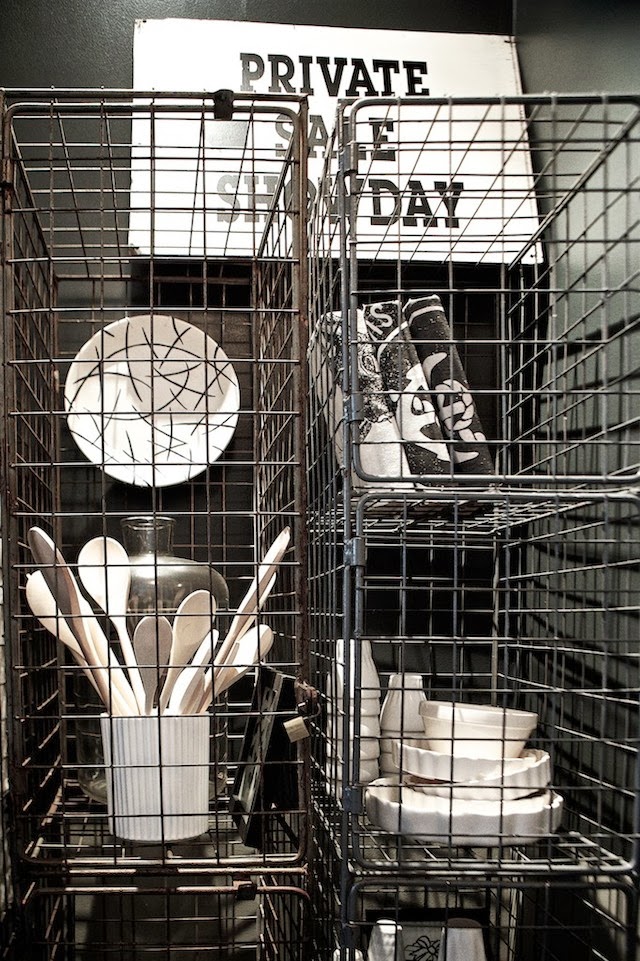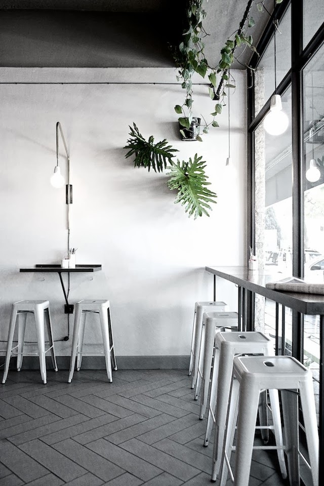 Me gusta la sencillez del espacio, sin grandes pretensiones, en blanco y grises, la instalación eléctrica vista, los taburetes Tolix y el pequeño toque de color que aportan las plantas colgantes.