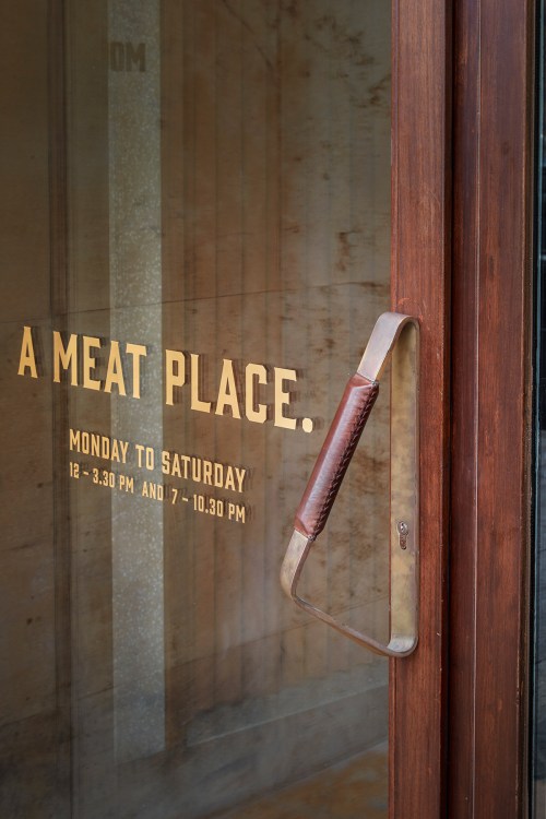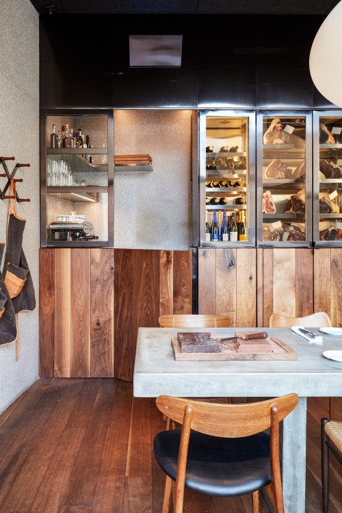 Una larga mesa común ocupa el espacio central del restaurante, dividida en dos para facilitar el trabajo de los camareros. Sobre la mesa, dos lámparas de la década de los 70 y sillas vintage. «Spock Design firma las perchas de acero y cuero que cuelgan de la pared. El cuero también se ha empleado en la cortina que separa la zona de los baños y recuerda, deliberadamente, a las cortinas de plástico de los mercados tradicionales de carne.»