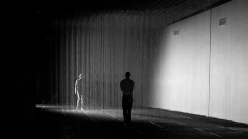 «Rain Room is a hundred square metre field of falling water through which it is possible to walk, trusting that a path can be navigated, without being drenched in the process.»