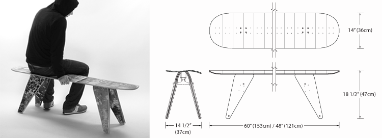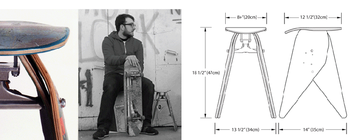 «Solidly crafted using once shattered skateboards and held together by a skateboard truck, the deckstool is strong and stable! Finely finished edges frame beautifully scuffed graphics that tell the story of the decks’ previous lives. A great side stool or table, the deckstool is especially versatile in rooms with limited floor space. Also excellent as a video game stool, or guitar/drum stool. We guarantee the quality of our products and your satisfaction»