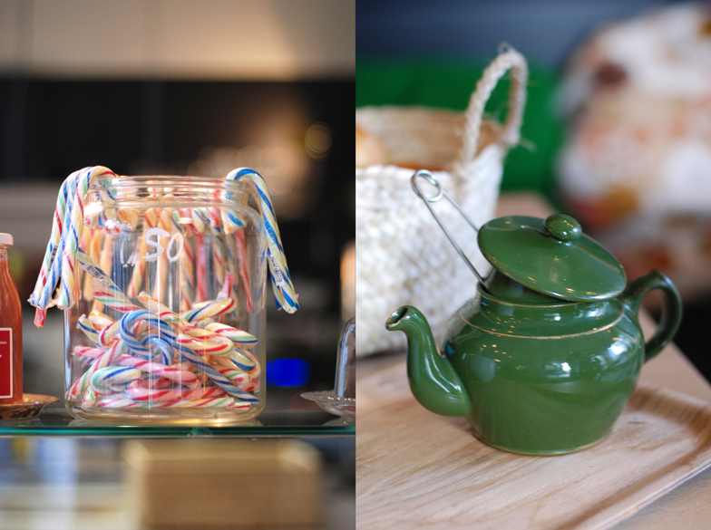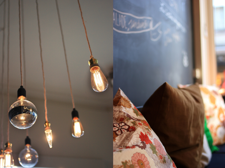 De todos ellos, destaco dos que han llamado especialmente mi atención: el entramado de tuberías de cobre combinadas con las lámparas colgantes y el efecto visual logrado con el mostrador de mármol y el pavimento de baldosas hexagonales, recordándonos a la leche que se derrama por el suelo de madera.