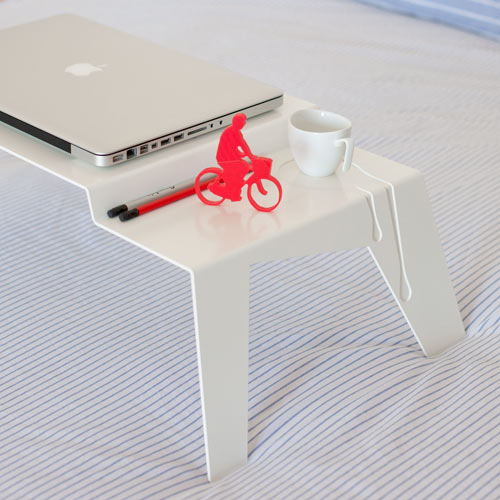 Hecha de una lámina de aluminio con cuatro pliegues, Bravo puede mantener tu portátil y tu desayuno de domingo al mismo tiempo.