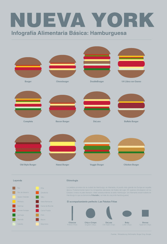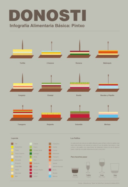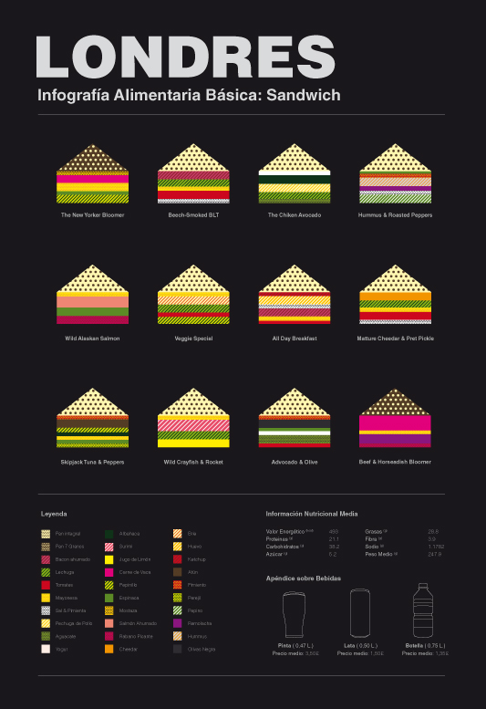 Como podéis ver, las infografías muestran los alimentos más característicos de 5 de las grandes ciudades: el sushi en Japón, las pizza en Nápoles, las hamburguesas en Nueva York, los pintxos en Donosti y los sandwiches en Londes. El objetivo es mostrar de forma muy visual y esquemática la diversidad de ingredientes entre platos de la misma familia. Bon Appétit!