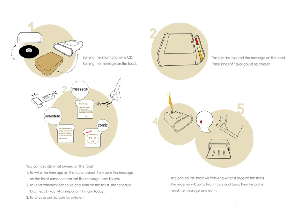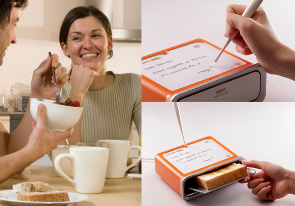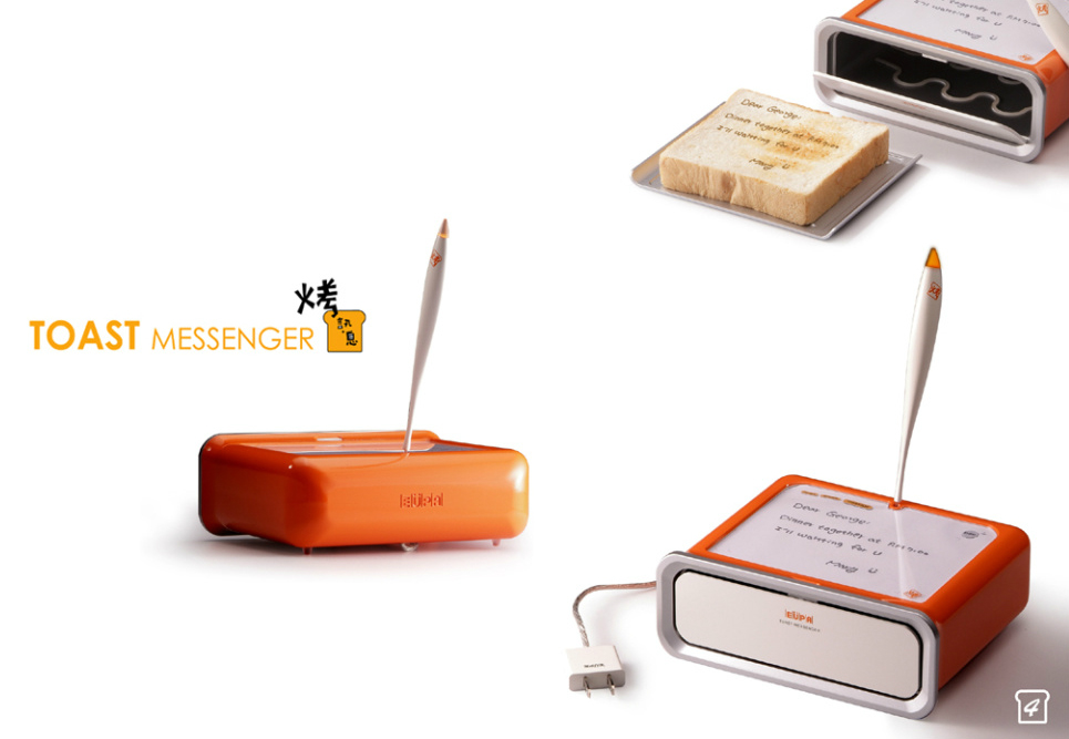 Toast Messenger by Sasha Tseng es básicamente una tostadora individual, es decir para una sola tostada, pero con la peculiaridad de que puedes escribir o dibujar en la base de la máquina y el mensaje quedará «impreso» en la superficie de la tostada.