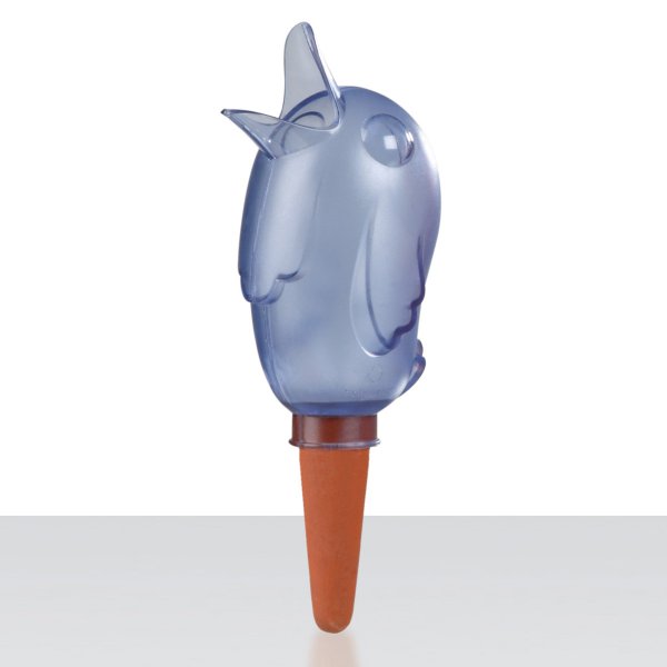 «With the Water Supplier Bördy, plants can determine for themselves how much water they need to “drink”. Bördy is simply inserted into the soil of the potted plant and is filled with water through its beak. Then the water is gradually released through the clay pointed end. The plant gets what it needs and watering plants or plants drying out are simply passé. Bördy´s transparent, plastic body will easily show when it needs to be refilled.»