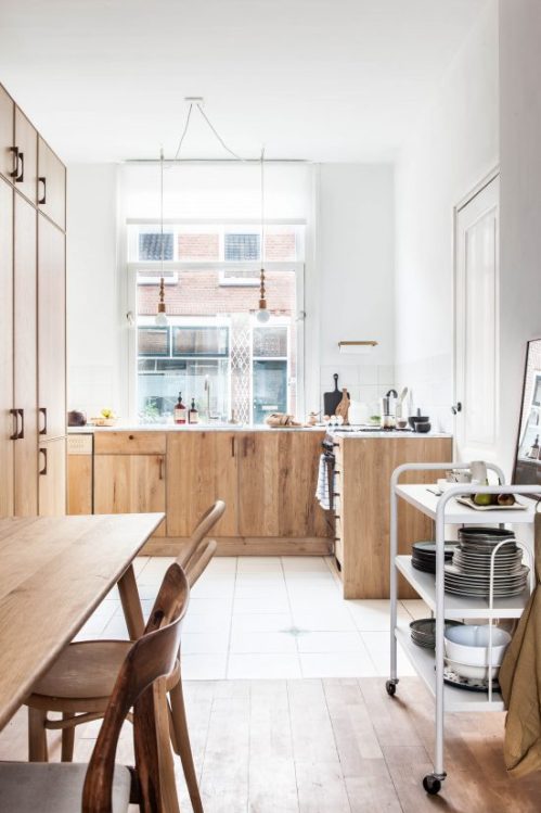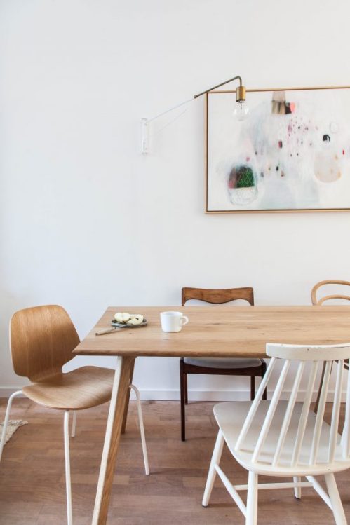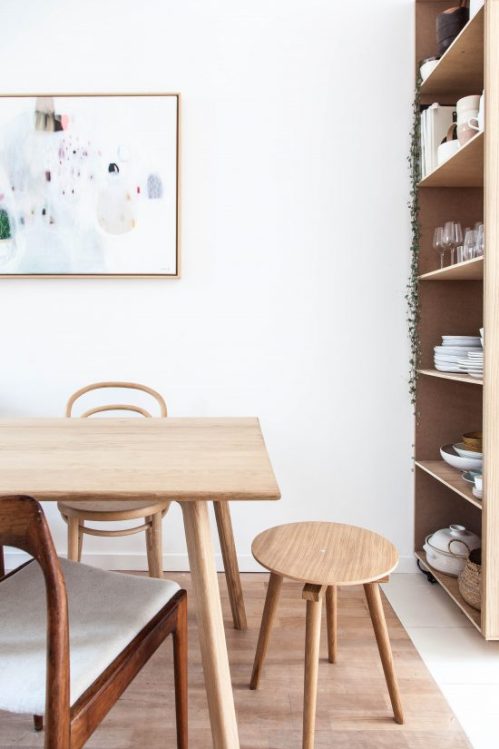 Como podéis ver, el acabado del suelo está dividido en madera para la zona de comedor y azulejo para la cocina. Todos los muebles son de madera, las sillas y el taburete son una combinación de distintos modelos vintage.
