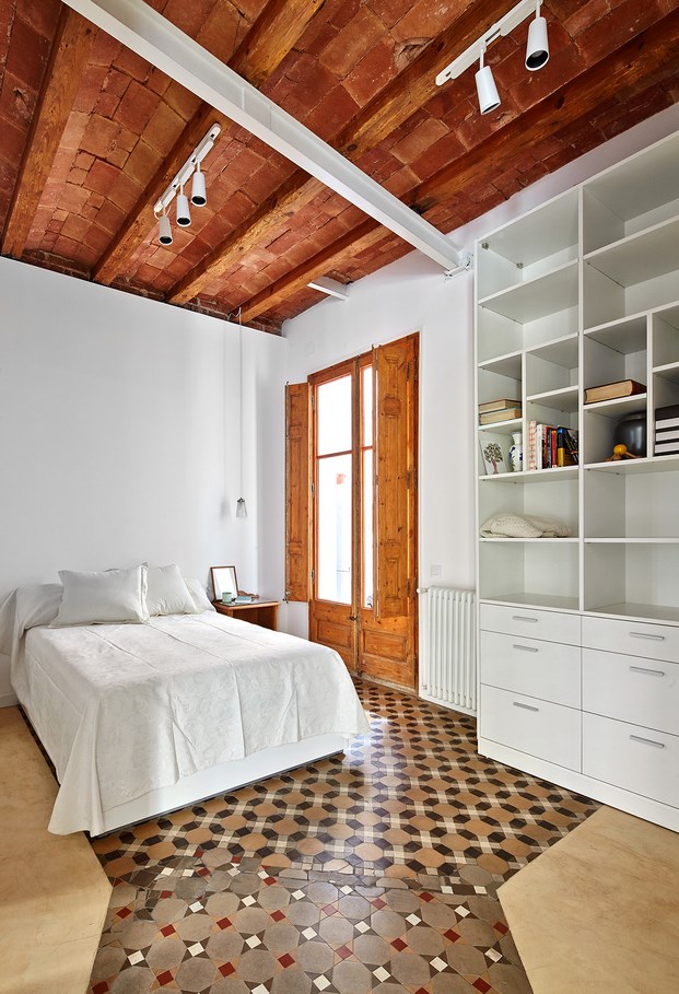 El dormitorio, decorado en tonos ocres a través del papel pintado y de los textiles, tiene un aire antiguo, remarcado por el maravilloso armario vintage de madera y algunos de los objetos decorativos de anticuario, como los juguetes antiguos.
