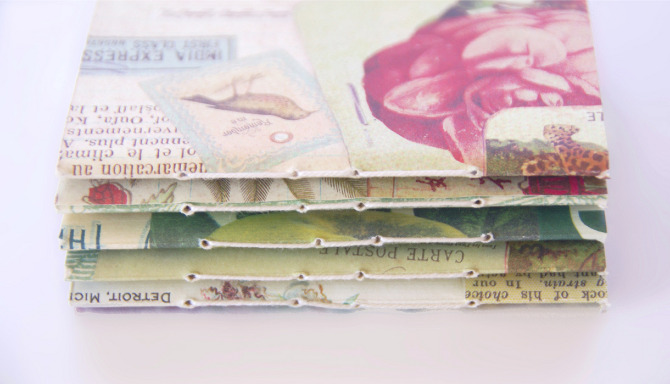 Libretas hechas a mano, con cartón, telas, papeles estampados y papel kraft.