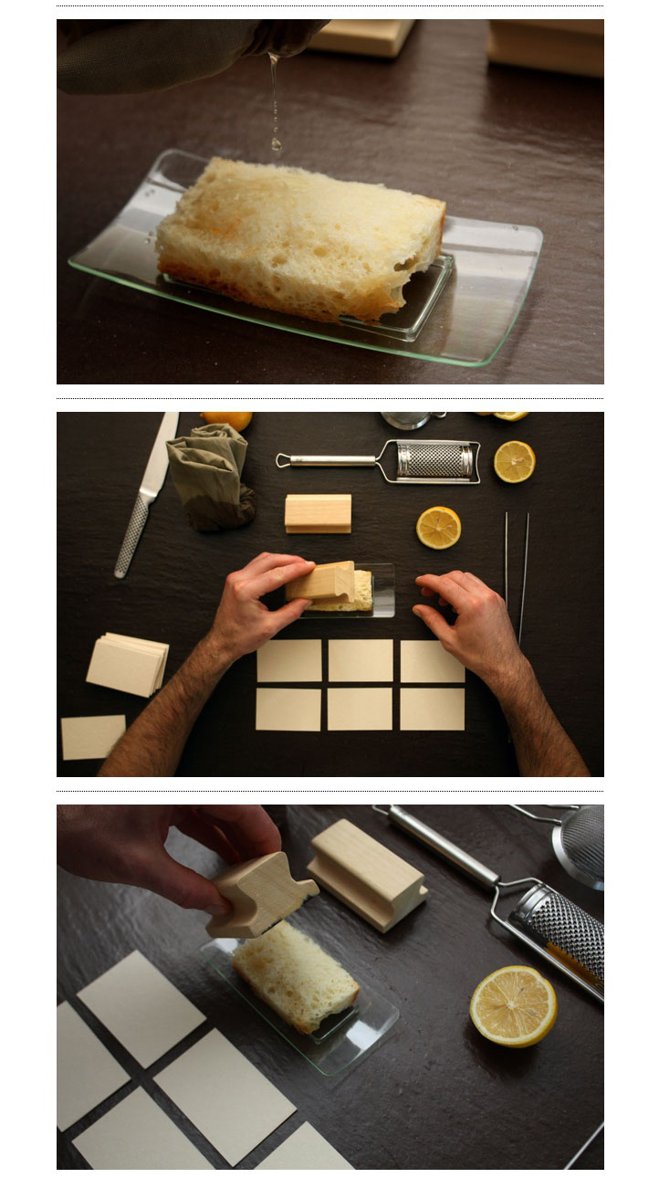 ¿Que cómo funciona? Pues la receta viene dibujada e impresa en un papel de hornear. Uno solo tiene que seguir las cantidades indicadas y colocar cada ingrediente siguiendo los dibujos marcados. Una vez dispuestos todos los ingredientes basta con juntarlos, enrollar el papel y hornearlo según lo indicado.