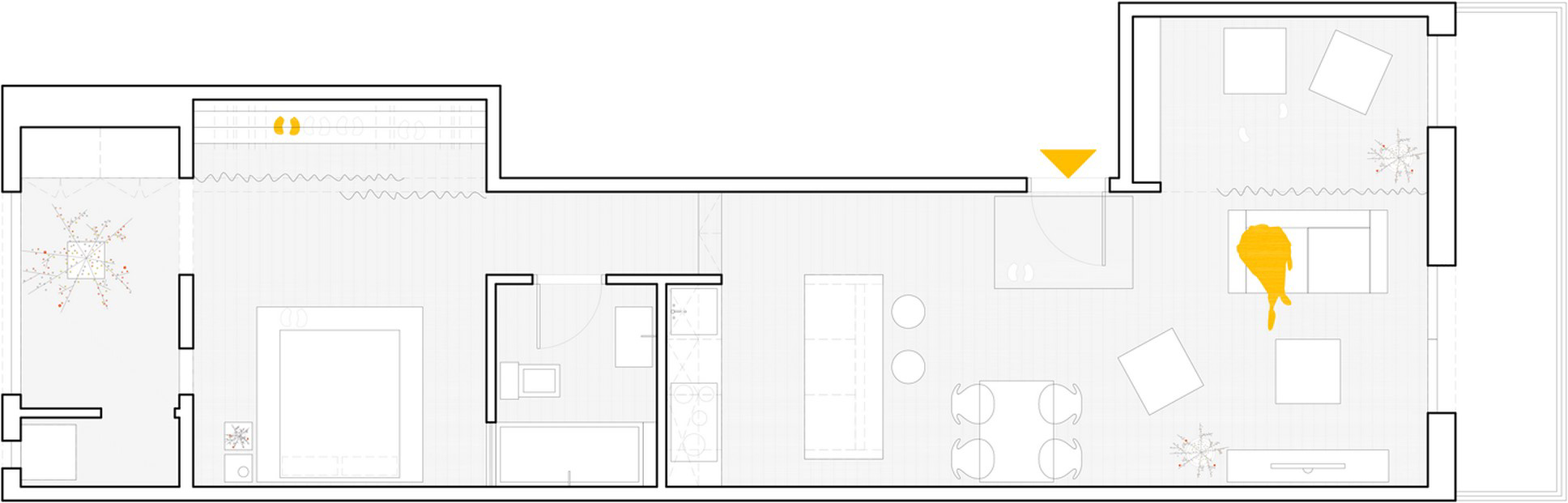 «La distribución de la casa es muy particular. Con una planta bastante longitudinal, el acceso a la calle da pie al recibidor y al dormitorio principal. Luego, a través de un pequeño pasillo, llegamos a una gran estancia que acoge la cocina, el comedor y el salón bajo el techo abovedado. A continuación, separada por unos mínimos tabiques pero en contacto visual con el salón, le sigue una galería-estudio de lectura que da ya al patio posterior y el jardín. La casa se completa con otras dos habitaciones. Una de ellas también da al patio.»