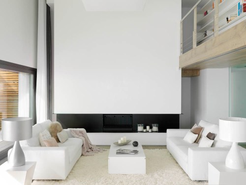 Por otro lado, en la sala de estar se ha instalado una chimenea central que propicia el confort y la lectura desde los dos puntos de vista