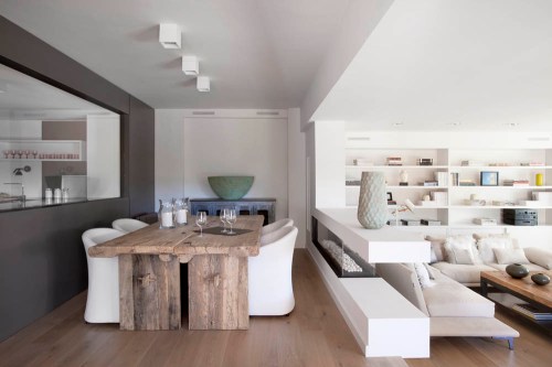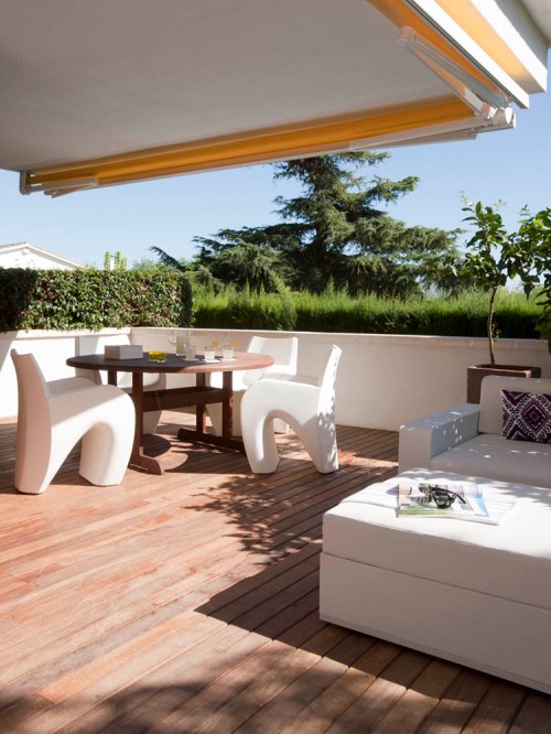 Así, la interiorista ha proyectado un gran espacio que abraza la terraza de la vivienda en una única área de la casa, la planta superior. En ella, dos cubos de DM lacado consiguen crear dos ambientes de comunicación familiar: la cocina y la sala de estar en el interior de la casa, y dos áreas de relax en el exterior.