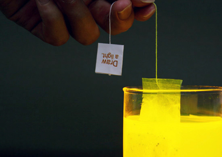 Se trata de unas bolsitas de té que se iluminan al entrar en contacto con una sustancia química. El proceso se desarrolla gracias al contacto de las partículas fluorescentes, de la bolsita, con el agente químico, creando luz.