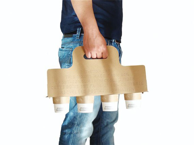 Pit-Stop café es un simple sistema ideado para transportar el café (cuatro como máximo) y todo lo que le pueda acompañar: azúcar, servilletas, cucharillas, algo dulce… Está diseñado con cartón reciclado (una sola lámina plegada sobre sí misma) y la tipografía va troquelada sobre el mismo material, de modo que tampoco es necesaria la tinta. Se acabó el «¡Cuidado que quema!».